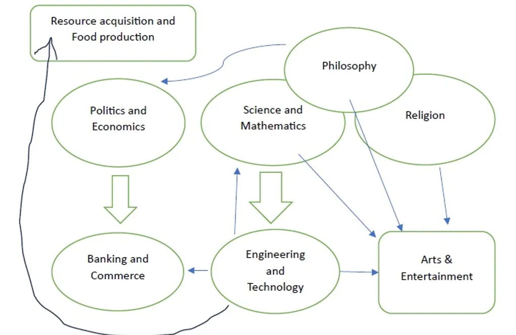 Figure 1 attempts to break down human endeavour into broad classes and show some of the relationships between them. A thick arrow between A and B indicates that A directly leads to B whereas a thin arrow indicates that B may or may not borrow ideas and tools from A. While all the thin arrows should actually be double headed, I have emphasized the direction in which the flow generally occurs.